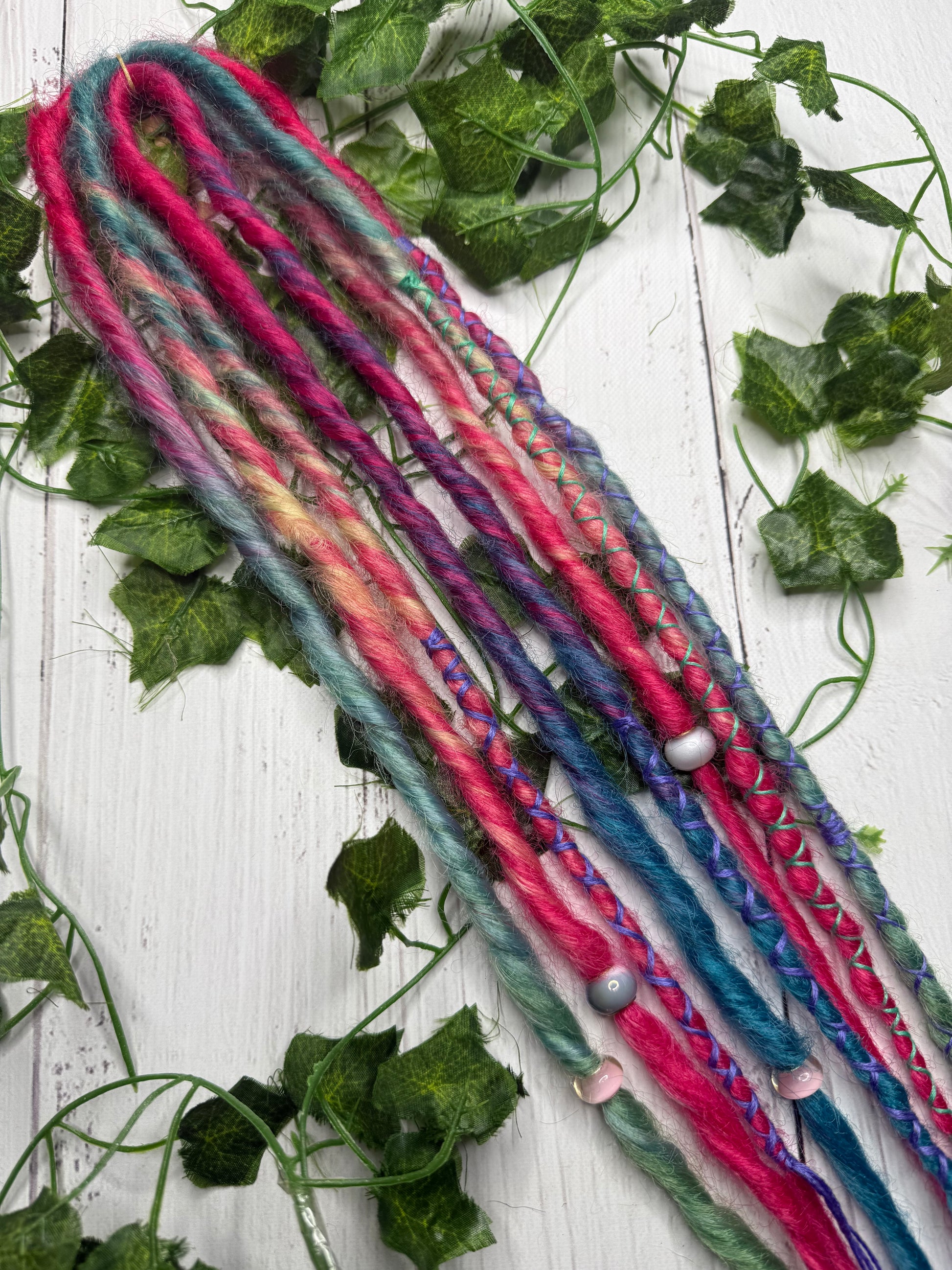 This is a set of double ended twisted dreadlocks. They have been decorated in assorted cottons and beads as shown in the photos.