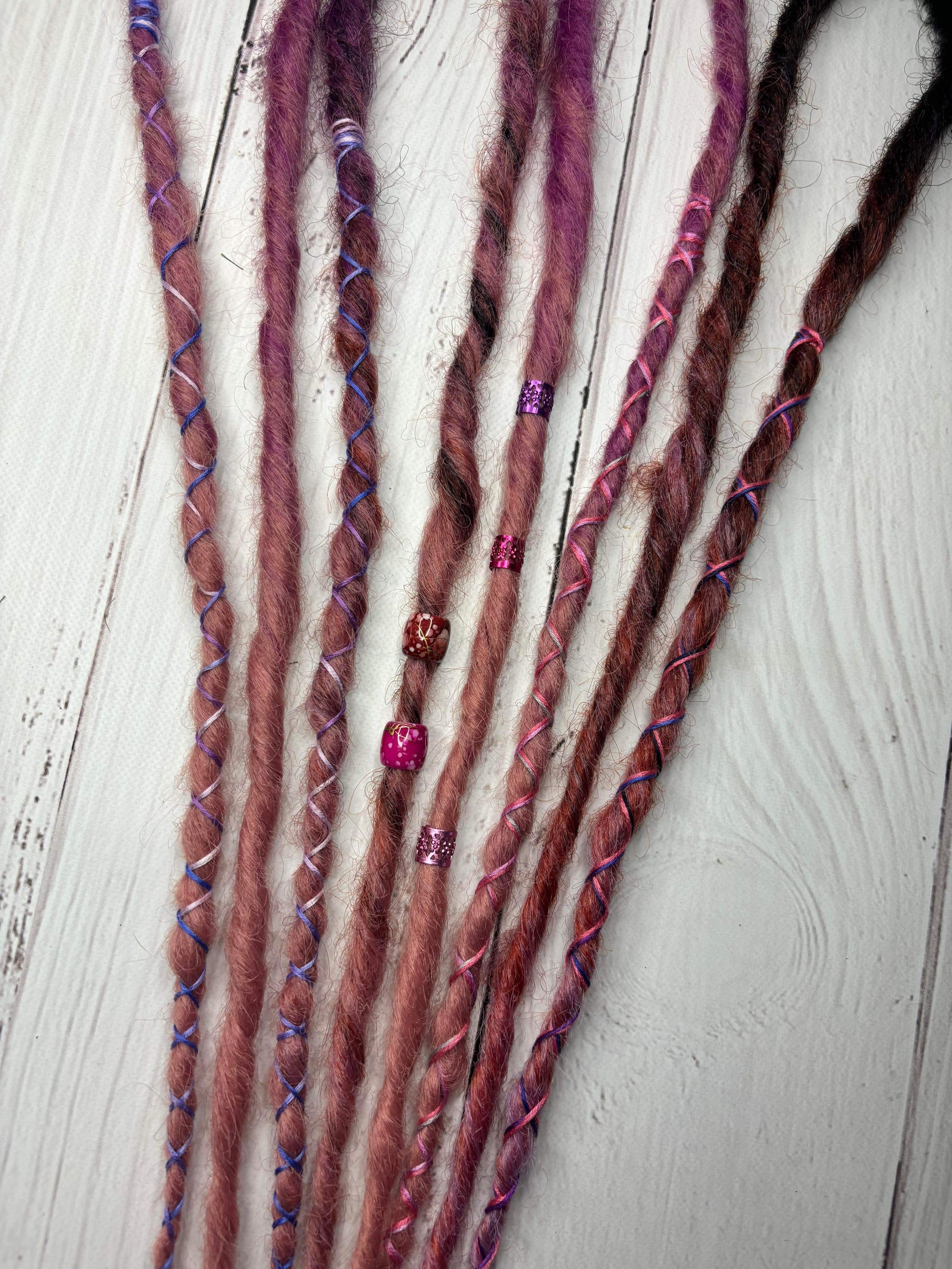 This is a set of double ended twisted dreadlocks. They have been decorated in assorted cottons and beads as shown in the photos.