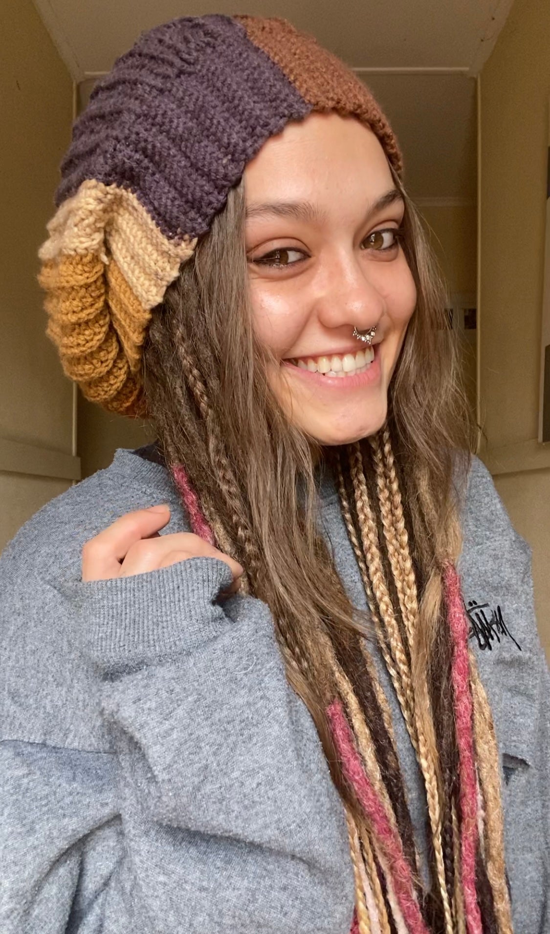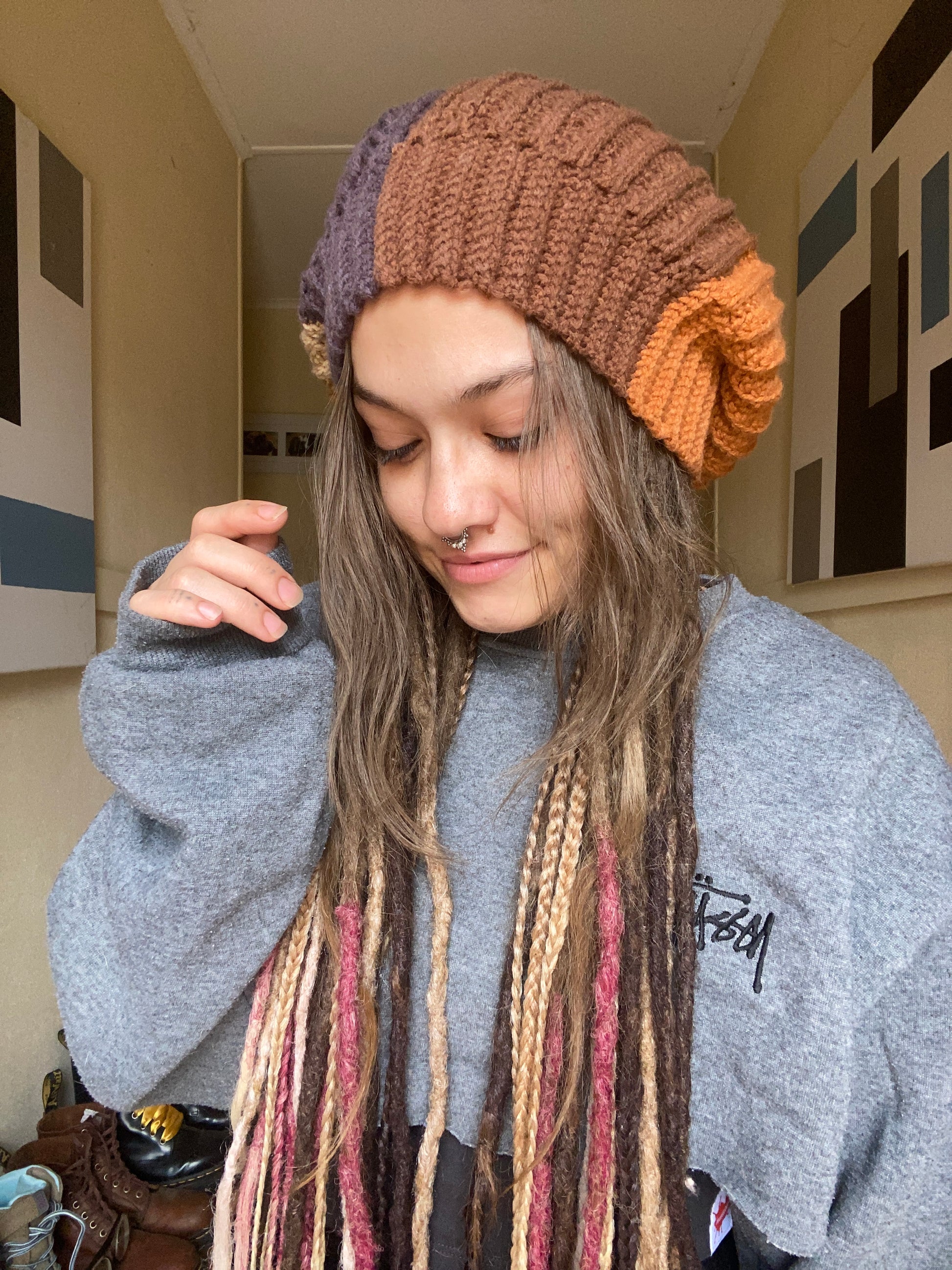 All beanies and headbands are handmade, one of a kind and made with care. They’re made large so that there is enough room for your locks!