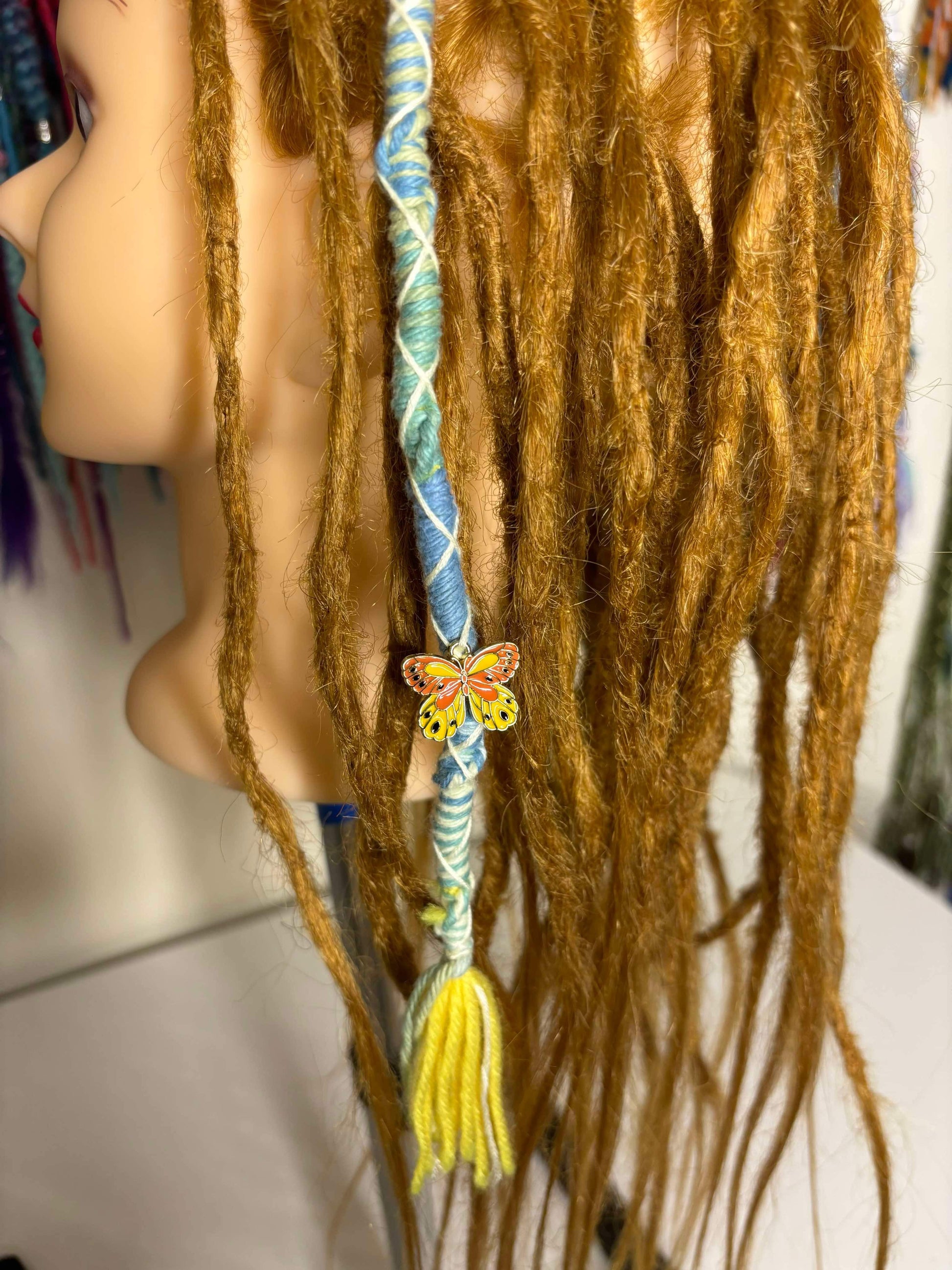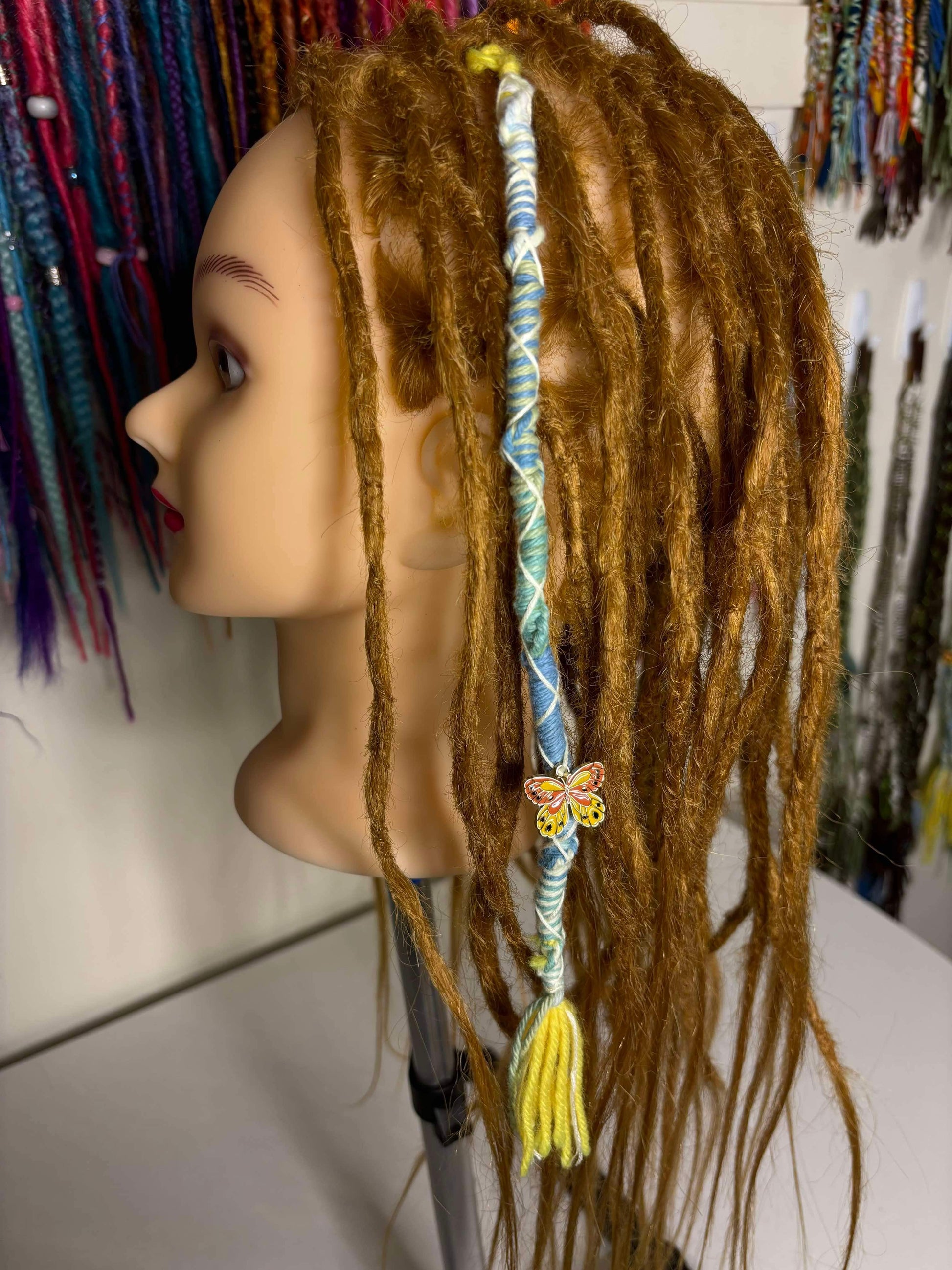 Wearing beads or thread wrapping your dreadlocks can be damaging overtime as it can cause weak spots with in the body of the dreadlock. I have created my lunalockshop dreadlock wraps so that you can have the look of decorated dreadlocks without the stress of damage!