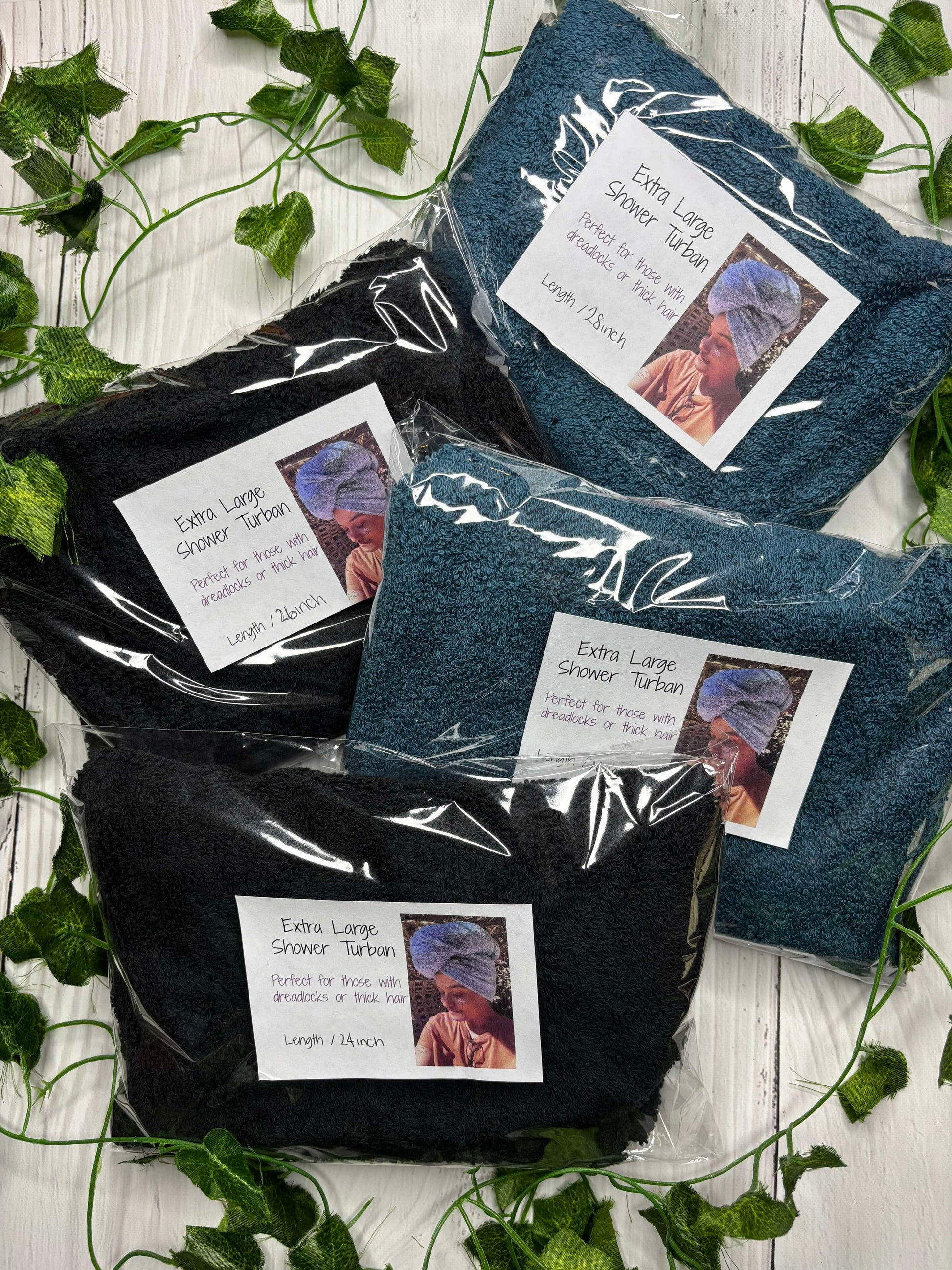 No more water dripping down your back for hours after your wash your dreadlocks. The extra large shower turban is perfect for both thick hair and dreadlocks.