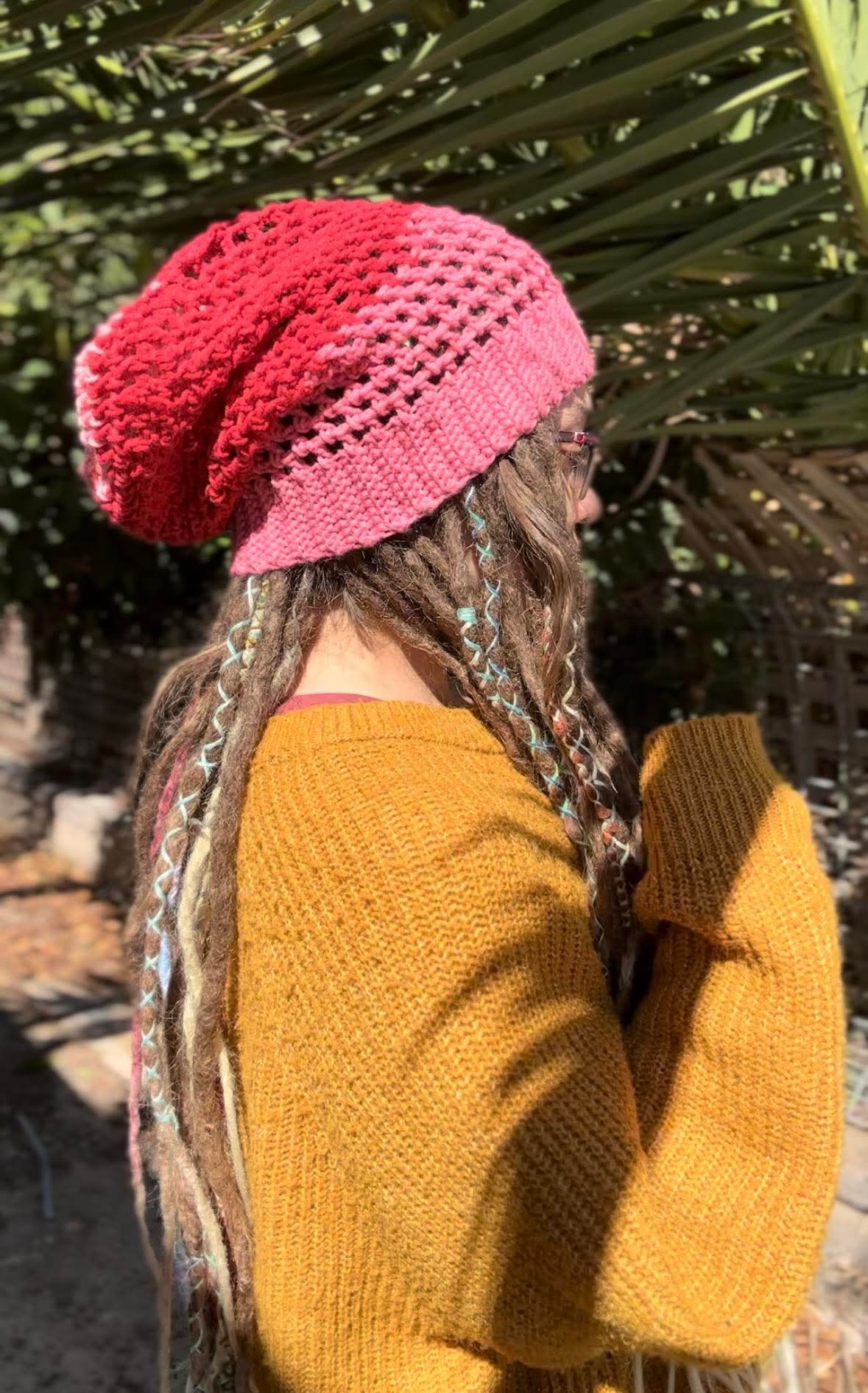 All beanies and headbands are handmade, one of a kind and made with care. They’re made large so that there is enough room for your locks!