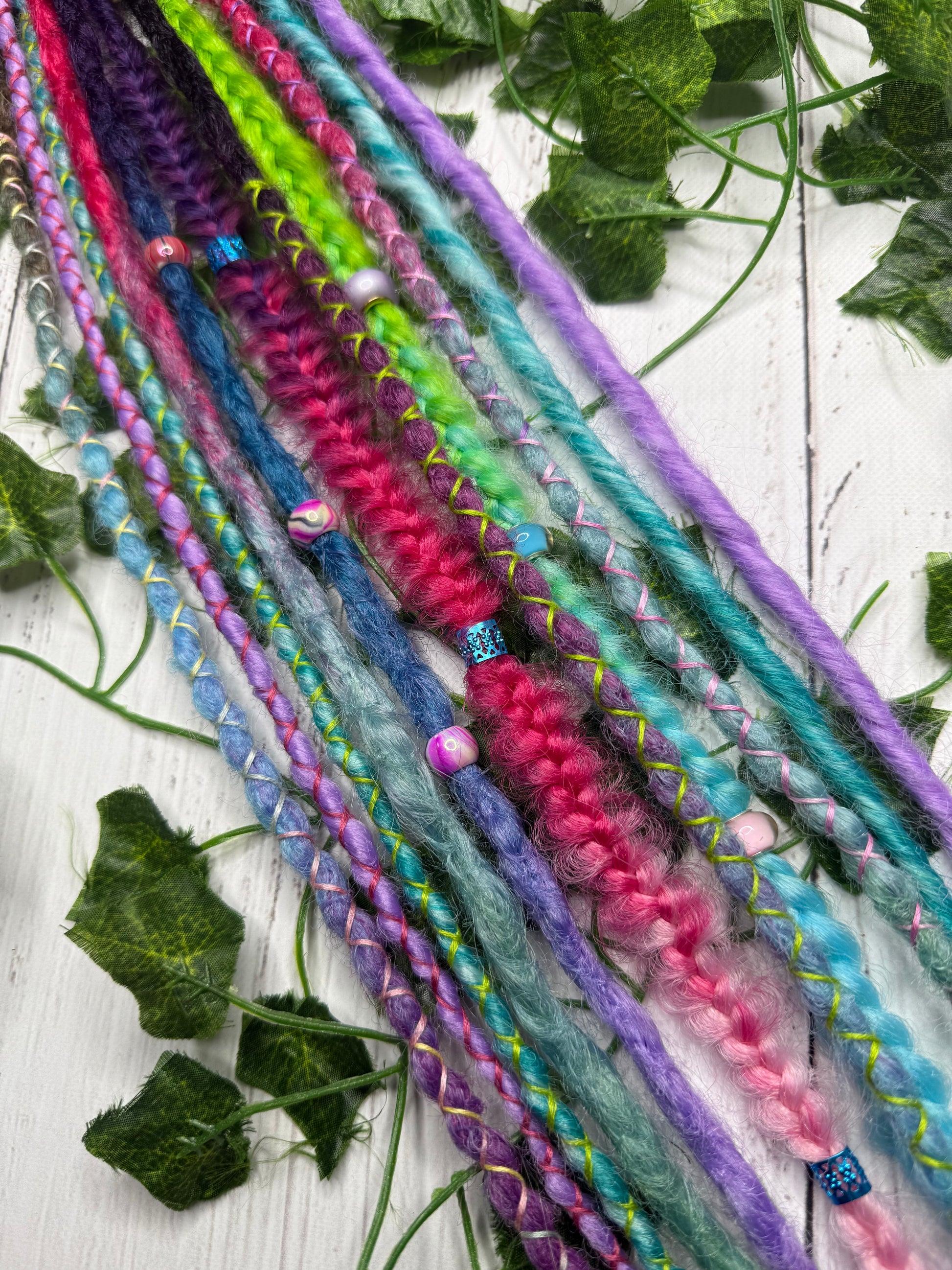Decorations extensions can be added to dreadlocks or loose hair for added colour, length or volume. They're a fantastic way to satisfy the urge to dye or change your hair/dreadlocks. The decorations are not added permanently but you can wear them for as long as you choose. They're very easy to self-install and since they're reusable you can wear them time and time again whenever you like! Owning multiple colour combinations is the best way to satisfy that urge for change without changing your dreadlock set long-term.