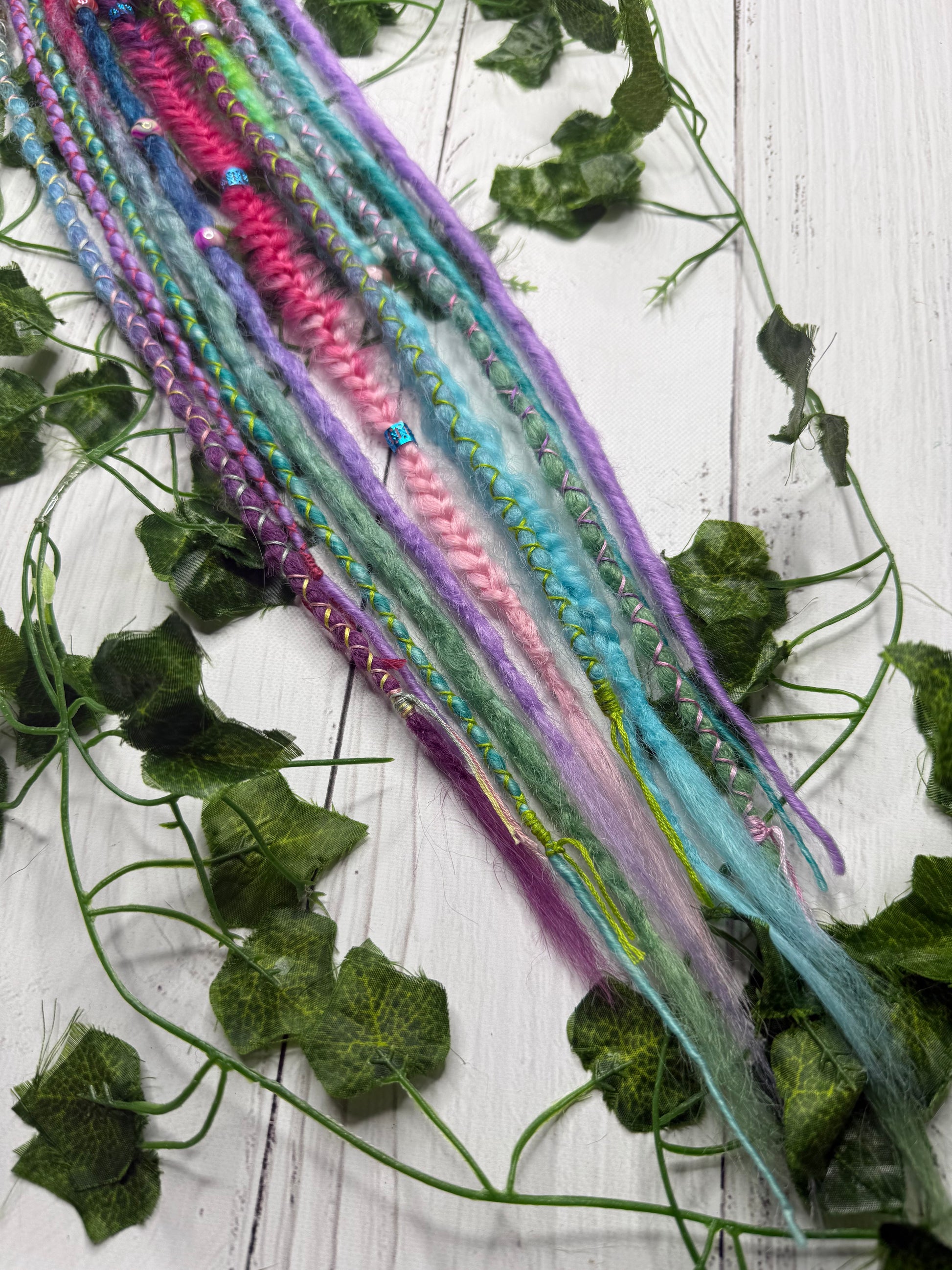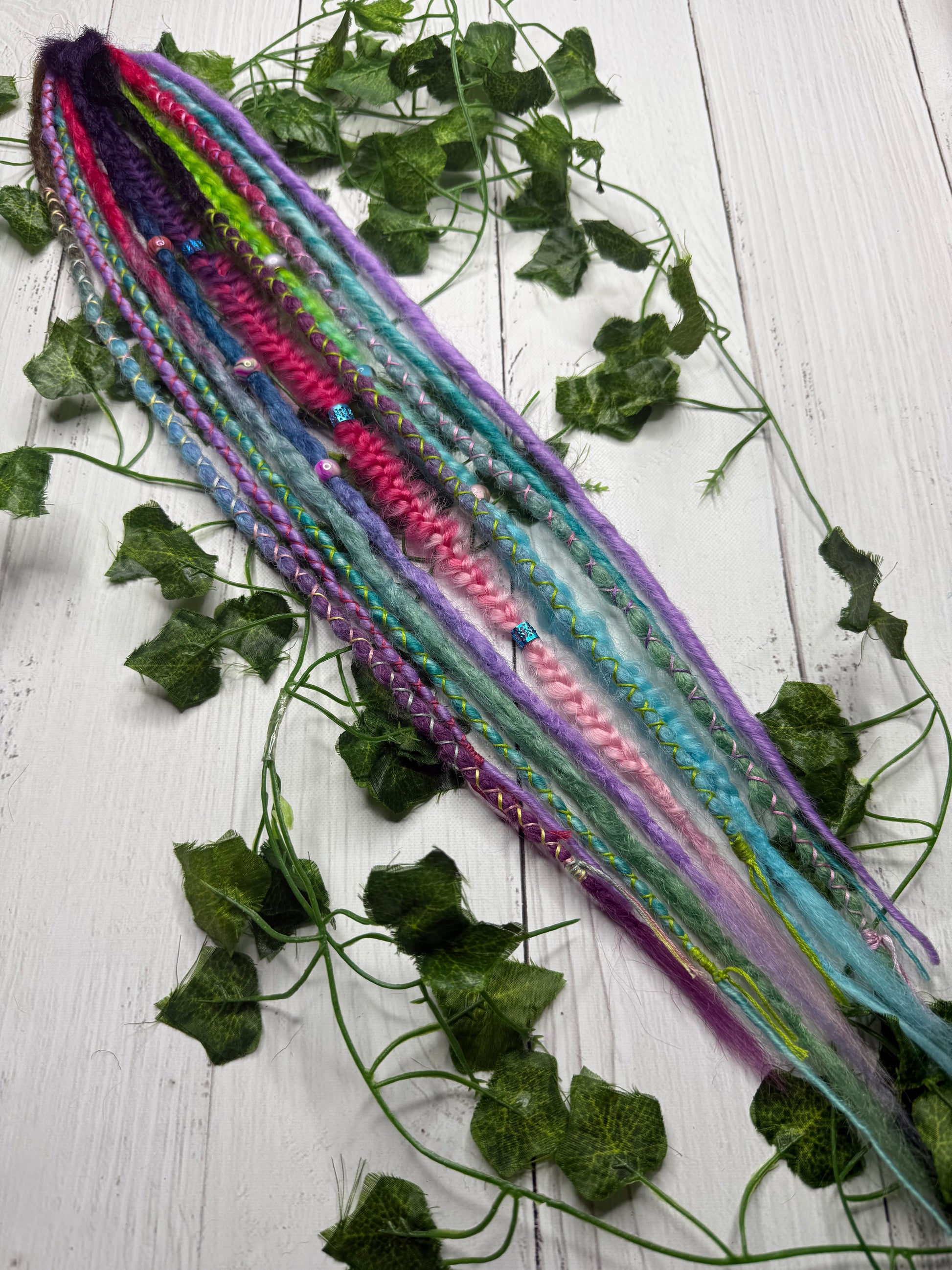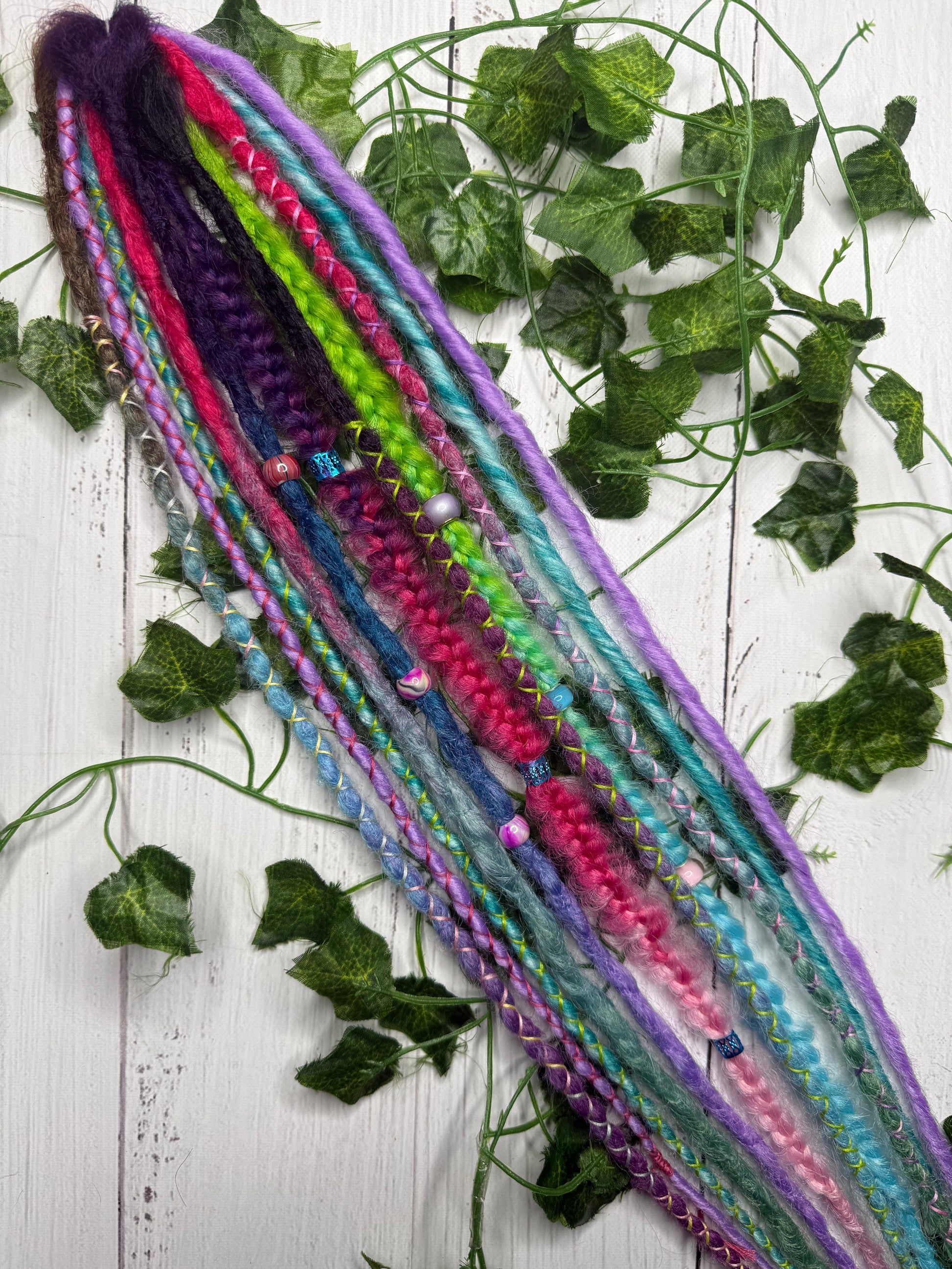 This is a set of crochet single and double ended dreadlocks, twisted dreadlocks and braids. They have been decorated in assorted cottons and beads as shown in the photos.