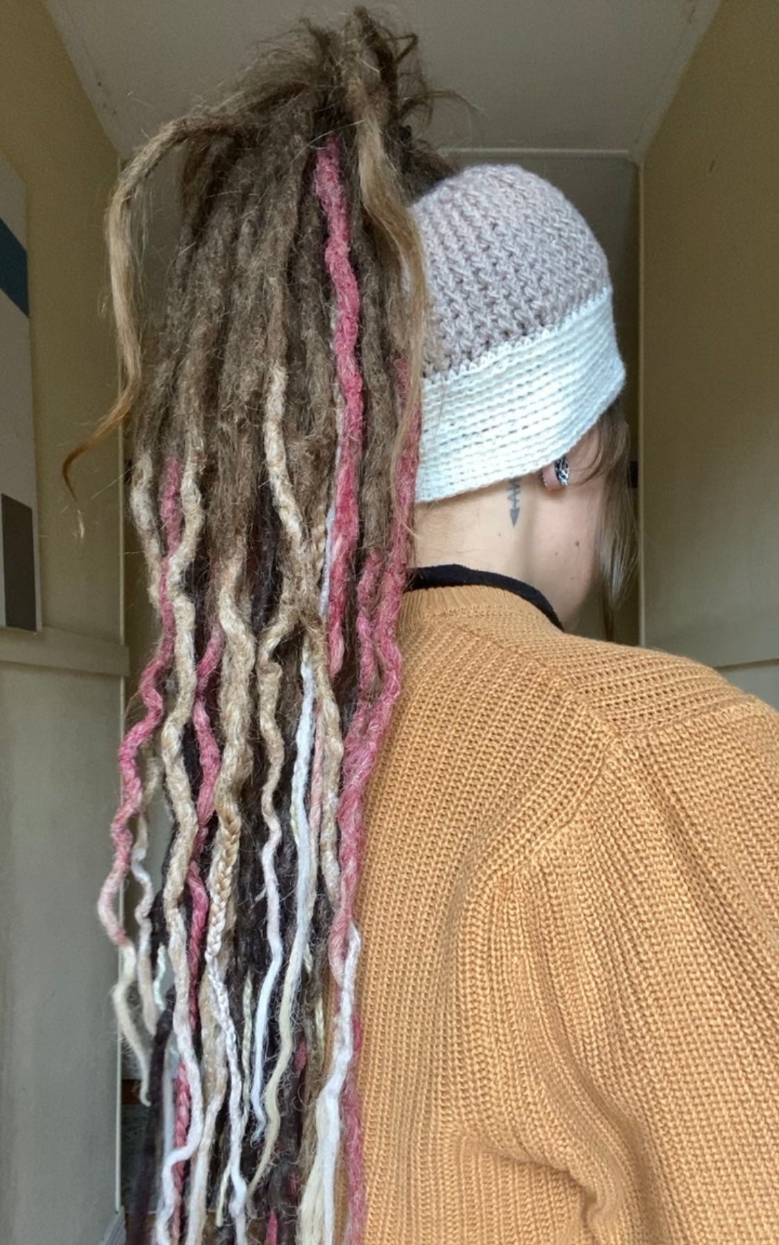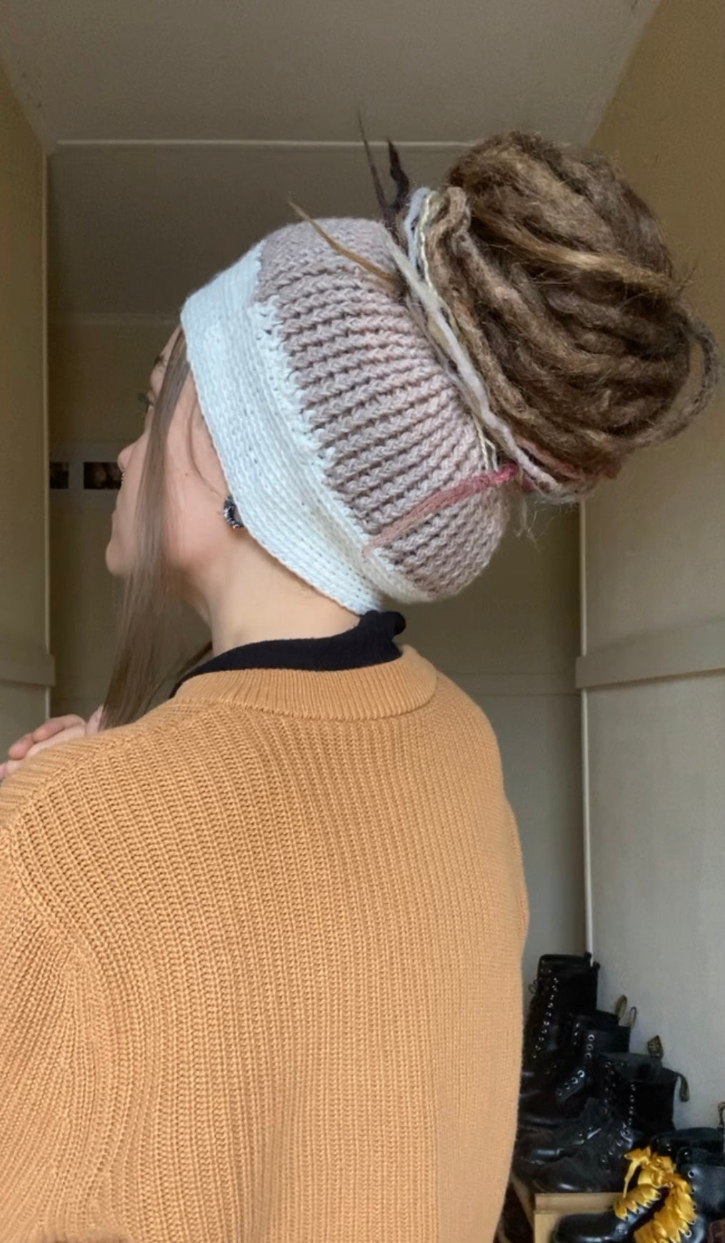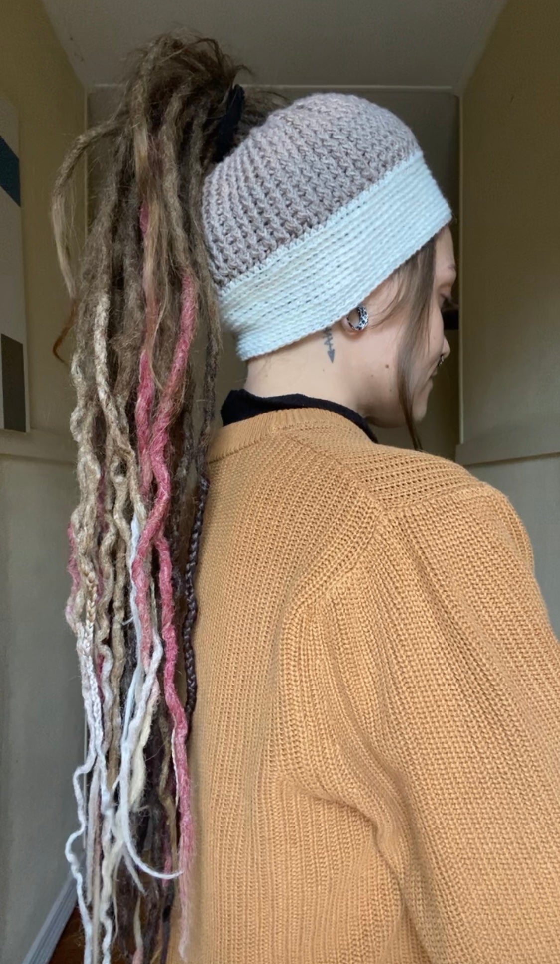 All beanies and headbands are handmade, one of a kind and made with care. They’re made large so that there is enough room for your locks!